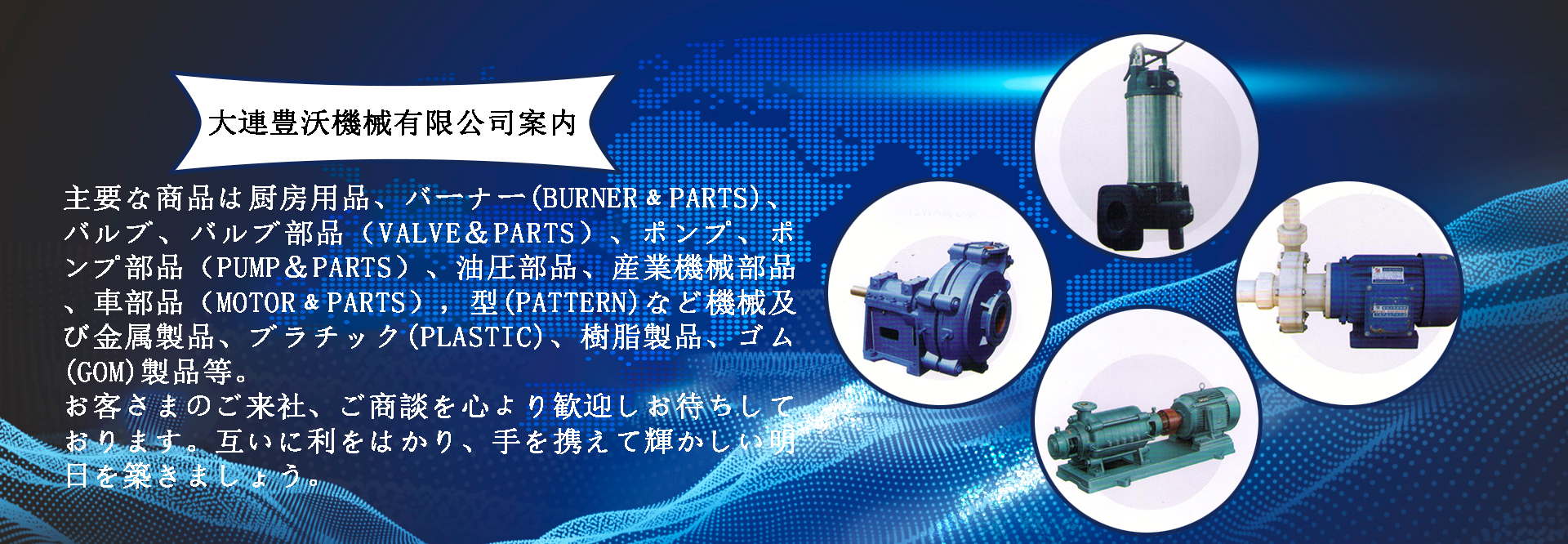 大連豊沃機(jī)械有限公司は國(guó)際貿(mào)易を主にして 専門(mén)商社でおり、子會(huì)社の機(jī)械加工工場(chǎng)を1社持ち、業(yè)務(wù)提攜パトーナが數(shù)社あります。國(guó)際貿(mào)易を従事して十年以上、メインは日本向けですが、アメリカ、ューロパ市場(chǎng)向けも少しあります。砂鋳造(CASTING)(FC,FCD,FACD,ADI)、ロストワックス(LOST-WAX)、鋳鋼(SC,SCS)、ステンレス(SUS)、ダイカスト(DIE-CASTING)(アルミ、真鍮)、鍛造(FORGING)、プレス(PRESS)、製缶(WELDING)など幅多く分野ております。主要な商品は廚房用品、バーナー(BURNER﹠PARTS)、バルブ、バルブ部品(VALVE&PARTS)、ポンプ、ポンプ部品(PUMP&PARTS)、油圧部品、産業(yè)機(jī)械部品、車(chē)部品(MOTOR﹠PARTS),型(PATTERN)など機(jī)械及び金屬製品、ブラチック(PLASTIC)、樹(shù)脂製品、ゴム(GOM)製品等。